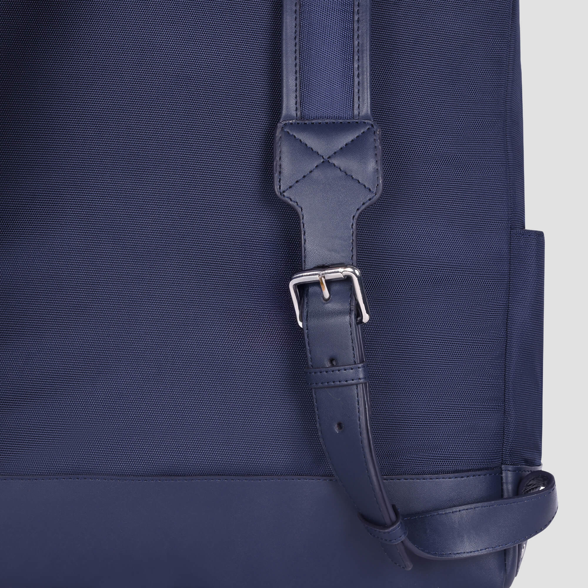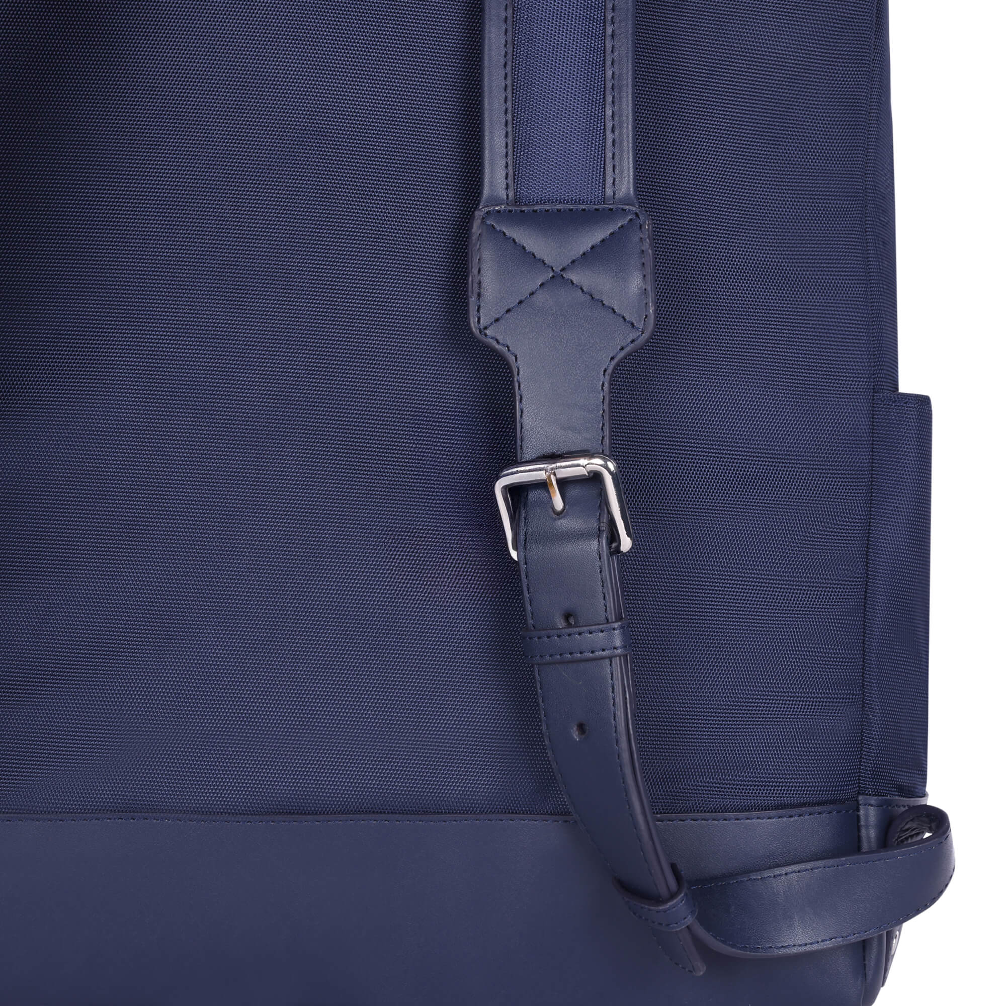 Adjustable padded shoulder straps with metallic buckle and leather accents for comfort and fit.