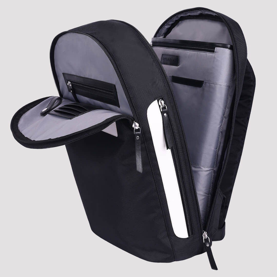 - The back main tech compartment features an incredibly functional interior organization system which includes a laptop compartment, zipper pocket, 3 slip pockets, pen holder and a mesh zipper pocket for safeguarding your travel essentials.
