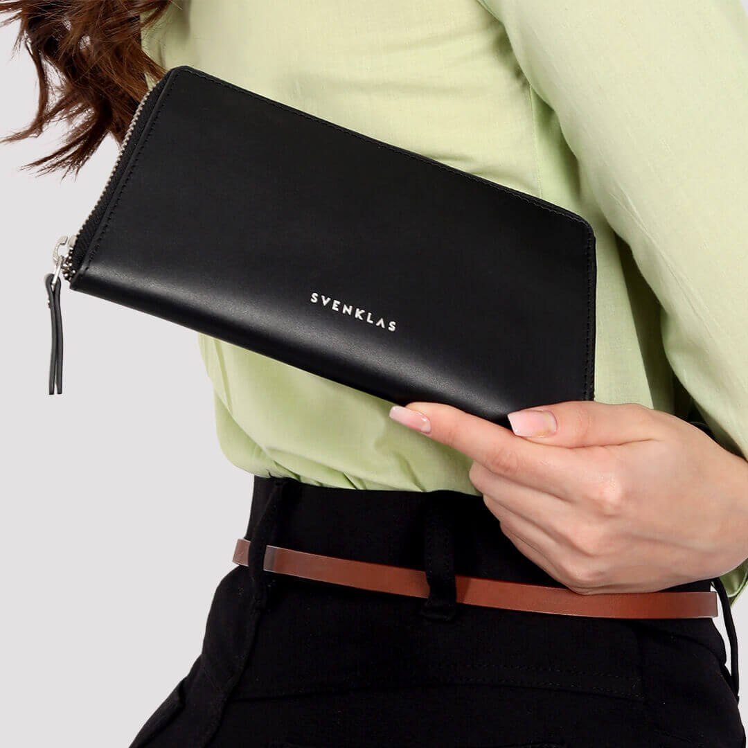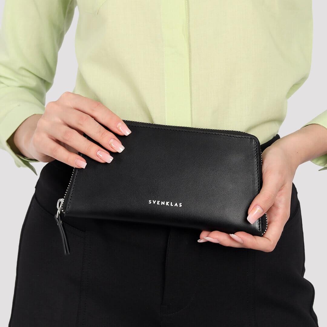 Aesthetically elegant and distinctly Scandinavian, Freya is a full-size women’s folio wallet with slim, intelligent storage. The minimal trapeze design and clean geometric lines give Freya a sophisticated, contemporary women’s wallet look. Handcrafted with Italian leather, Freya’s modern interior with contrast lining has space for cash, cards, bills, a smartphone and a clever zipper pouch so you can carry everything you need all day long.