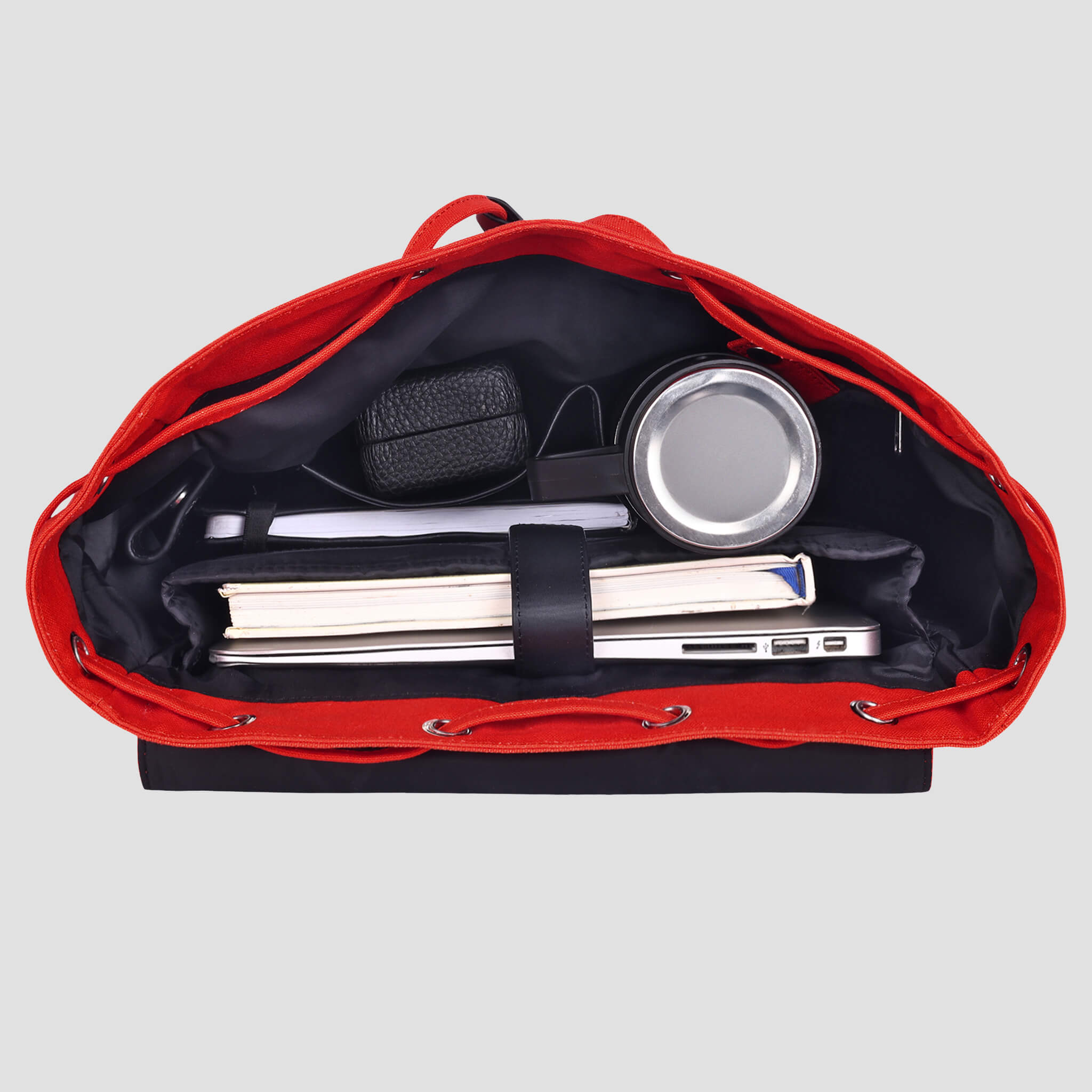 Leather detailing is used in the carry handle, flap tie, puller, drawstring ends, shoulder strap ends, under the flap pocket, keychain holder, velcro closure,and inner binding.
